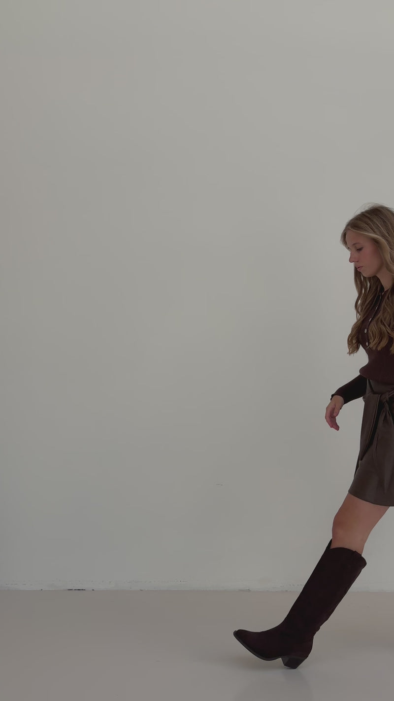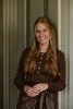Deze gebreide donkerbruine top combineert warmte met een stijlvolle uitstraling. De knoopjes en kraag aan de bovenkant geven een verfijnde, klassieke touch. Perfect voor een elegante en comfortabele look, zowel casual als chic.