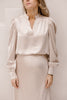 Deze prachtige champange kleurige blouse is een must-have voor elke kledingkast. Gemaakt van zwaar satijn, voelt deze blouse luxueus en comfortabel aan.