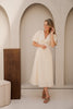 Deze lange botergele jurk heeft een elegante V-hals en een tijdloos silhouet. De warme kleur en zachte stof maken haar perfect voor elk seizoen. Een veelzijdige keuze voor zowel casual als geklede momenten.