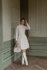 Dit korte A-lijn jurkje in licht beige heeft een verfijnde en tijdloze uitstraling. Gouden knopen op de schouder zorgen voor een elegant en chic detail. Perfect voor een subtiele, maar stijlvolle look.