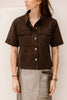Donkerbruine denim blouse met een stoere en tijdloze uitstraling. Comfortabel en veelzijdig, ideaal voor casual looks.