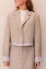 Diese kurze beige Jacke besticht durch ihren zeitlosen und stilvollen Look mit modernem Touch. Der Saum ist mit einem markanten Streifendetail versehen, das mit Knöpfen geschlossen und für einen minimalistischeren Look leicht abgenommen werden kann. So gelingt Ihnen mühelos ein Wechsel zwischen einem verspielten und einem klassischen Stil.