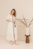 Een witte jurk met bruin stiksel die zorgt voor een subtiel en stijlvol contrast. De verfijnde details geven de jurk een unieke en elegante uitstraling. Perfect voor zowel een zomerse dag als een nette gelegenheid.