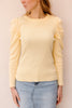 This light yellow top features playful puff sleeves for a feminine and trendy look. The soft fabric feels comfortable against the skin. Perfect for both elegant and casual outfits.