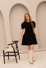 This short black dress exudes elegance and chic. The gold detailing on the hips adds a luxurious and striking touch to the design. Perfect for a festive evening or a stylish, polished look.