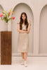 Champagnekleurige jurk met een elegante en verfijnde uitstraling. De jurk heeft een comfortabele pasvorm en is perfect voor feestelijke of speciale gelegenheden.