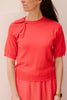 Deze basis rode top met een draai in de hals is eenvoudig maar opvallend. De subtiele twist zorgt voor een vrouwelijke en moderne uitstraling. Ideaal om zowel casual als chic te combineren.