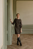 Dit korte, glimmende gouden jurkje trekt de aandacht met een subtiele panterprint die elegantie en lef combineert. De glans geeft het een feestelijke uitstraling, perfect voor een avondje uit. Een opvallend en stijlvol item voor wie durft te stralen.