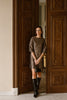 Dit korte, glimmende gouden jurkje trekt de aandacht met een subtiele panterprint die elegantie en lef combineert. De glans geeft het een feestelijke uitstraling, perfect voor een avondje uit. Een opvallend en stijlvol item voor wie durft te stralen.