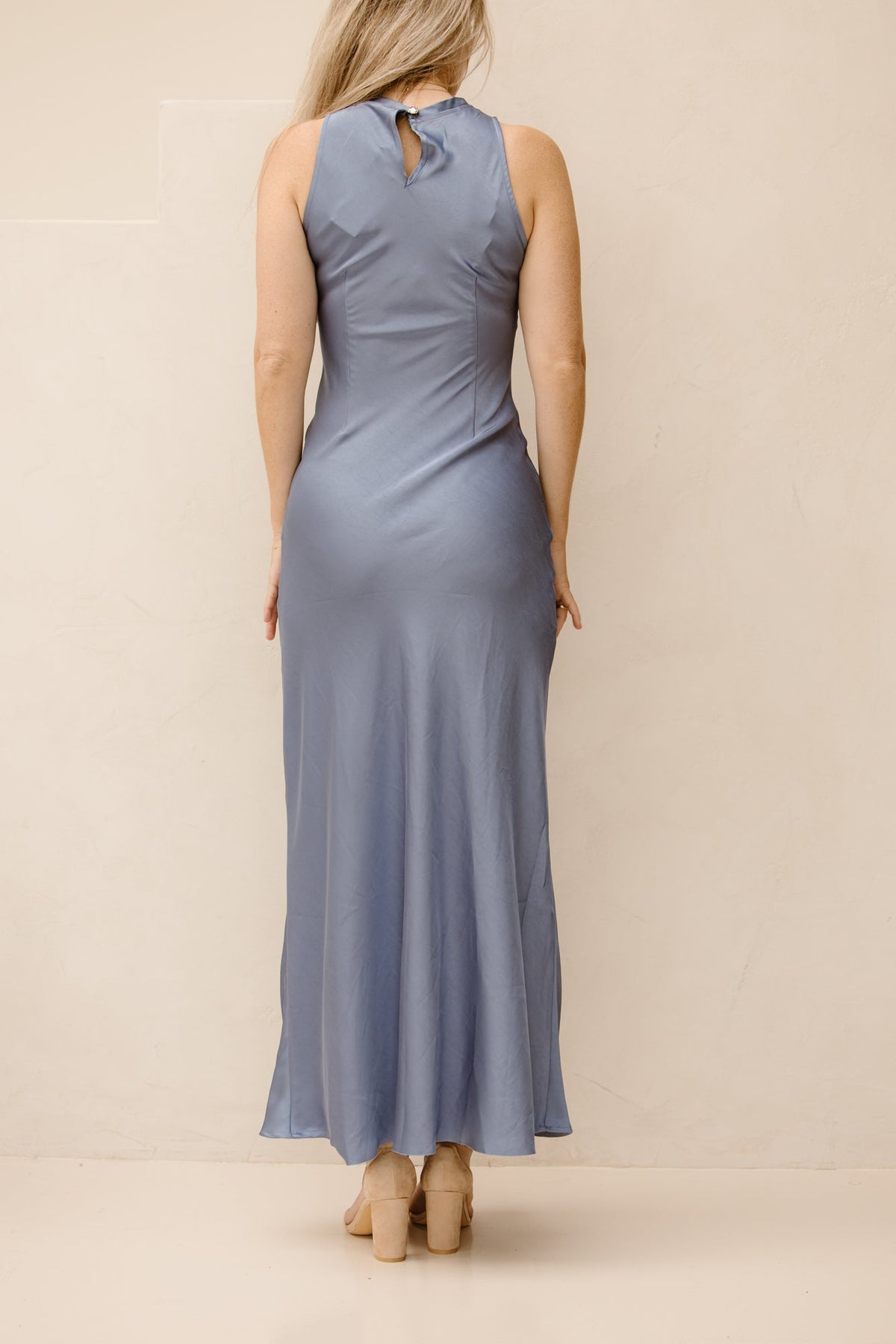 Deze lange, mouwloze jurk van satijn in een warme bruine tint voelt luxe en soepel aan. Het glanzende materiaal geeft een elegante en verfijnde uitstraling. Perfect voor een chique avond of bijzondere gelegenheid.