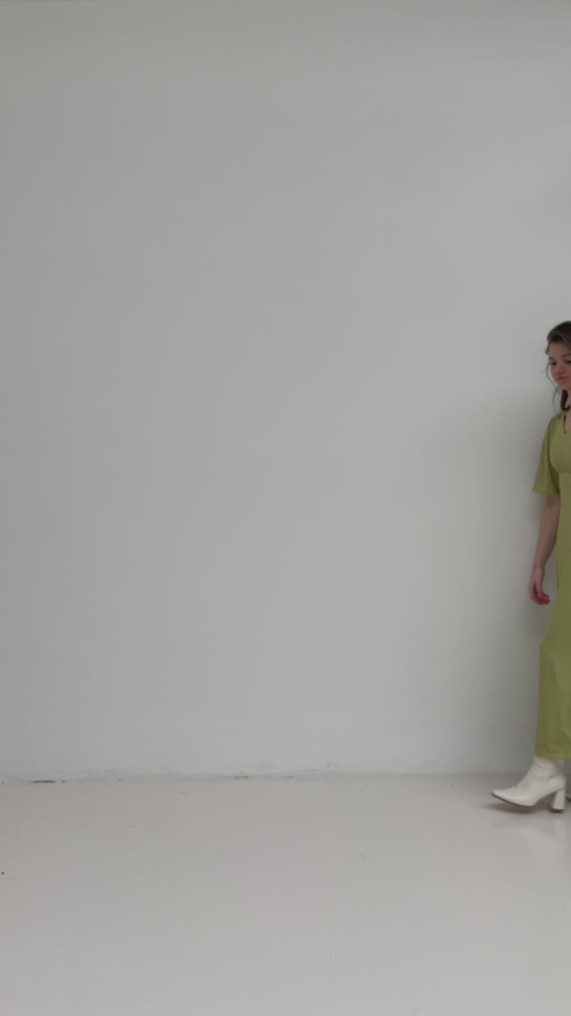 Deze olijfgroene kleur maxi jurk is een echte blikvanger met haar frisse en zonnige uitstraling. De V-hals en getailleerde pasvorm zorgen voor een elegante, vrouwelijke look die het silhouet mooi benadrukt. Dankzij de blinde ritssluiting aan de zijkant sluit de jurk naadloos aan en krijgt het geheel een verfijnde afwerking.