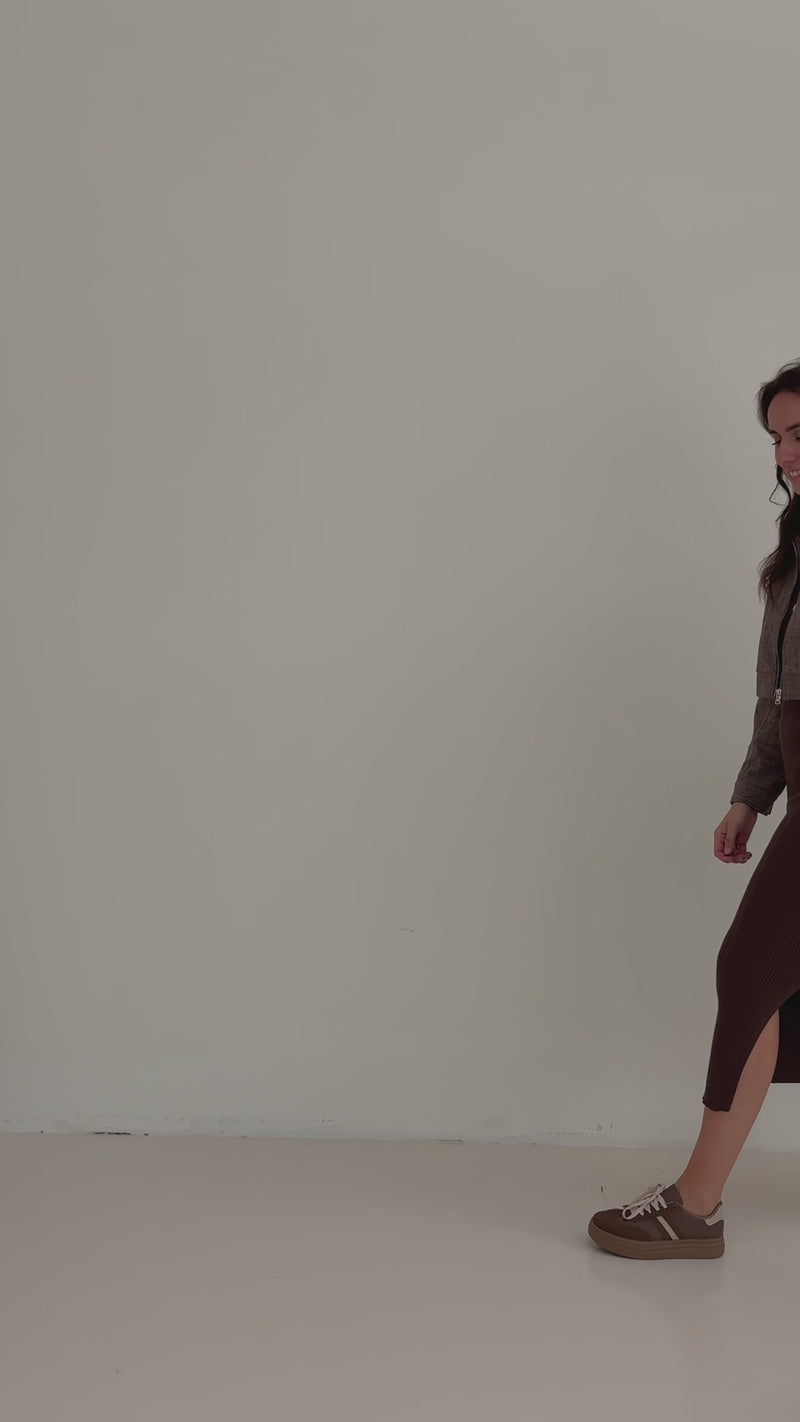 Dit korte bruine jasje is stijlvol en veelzijdig te combineren. Het elastiek aan de achterkant zorgt voor een mooie pasvorm en extra comfort. Perfect voor zowel casual als elegante outfits.
