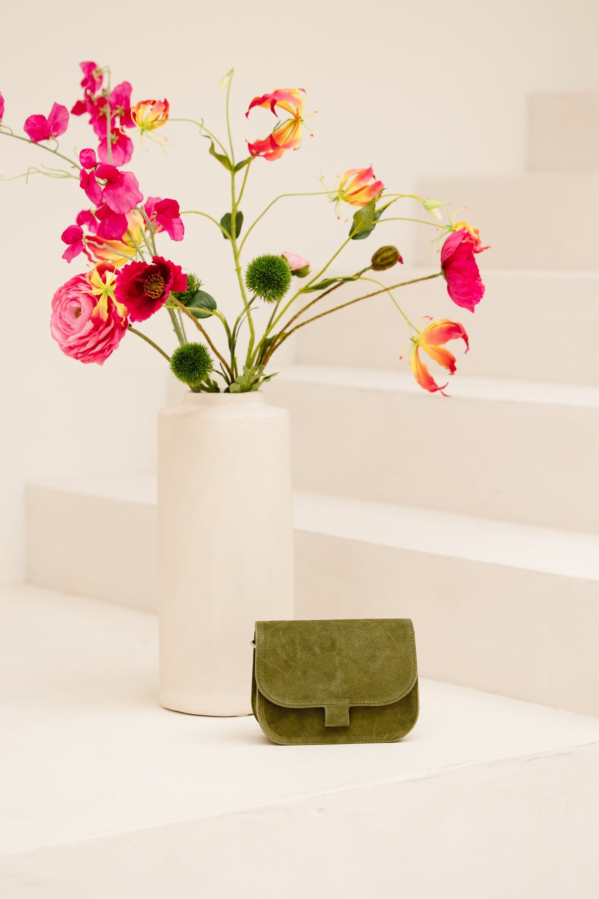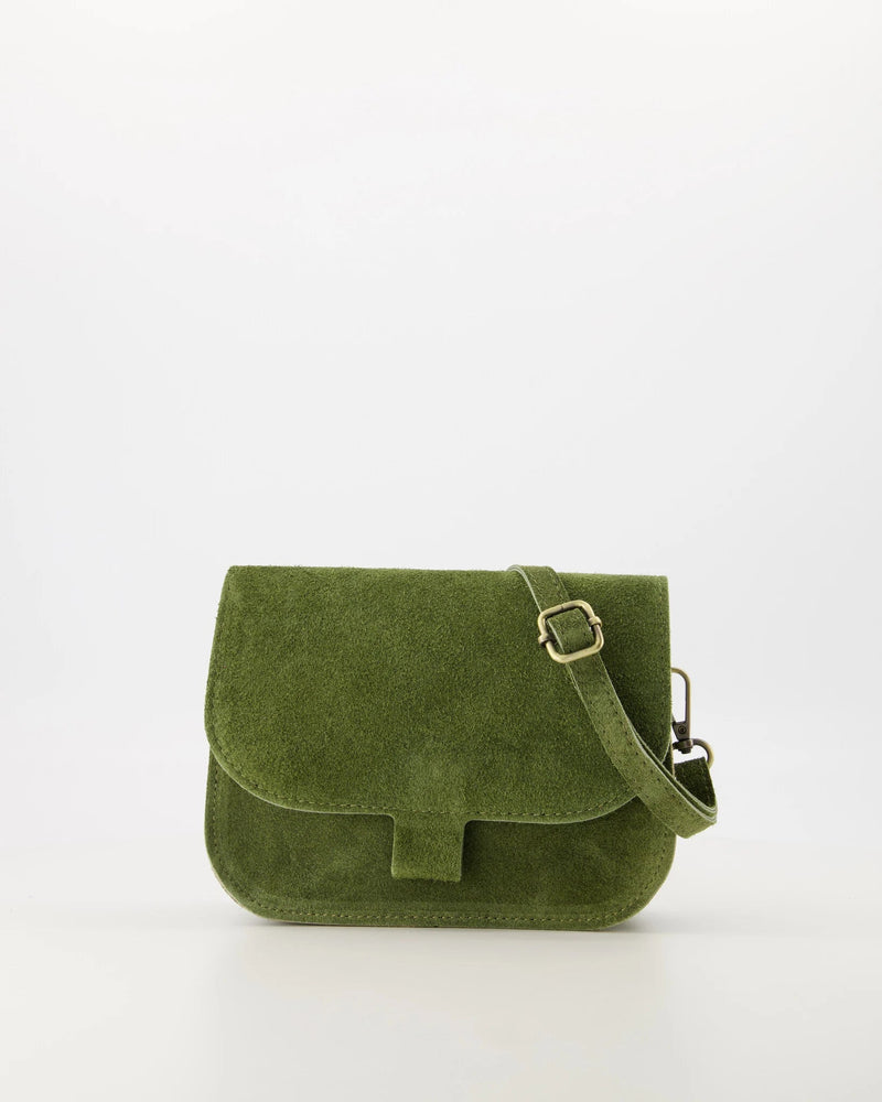 Suede leren crossbodytas met een magneetsluiting en een lang verstelbaar hengsel.